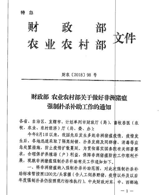 疫情发生后,各地迅速采取了隔离封锁、扑杀发病及同群猎、消毒等应急处置措施,防止疫情扩散蔓延。为贯彻落实国务院有关部署要求,合理保护养殖场(户)利益,保障非洲猪瘟防控工作顺利开展,现就非洲猪瘟强制扑杀补助有关工作通知如下。